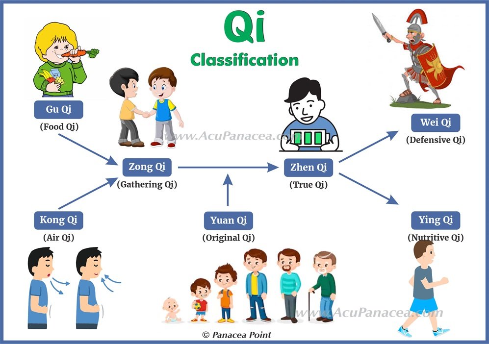 Qi is translated as energy, material force, life force, etc. But none of these terms completely encompass the meaning of Qi. The nature of Qi is ever-changing, shifting from one thing to another, sometimes rapidly, sometimes slowly. In practice, we identify or label Qi according to the job (function) it is doing now. It sounds complicated…let us make it simple.